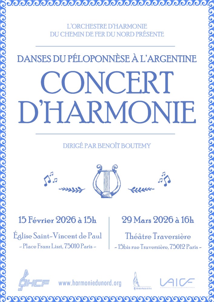 - L'OHCF (Orchestre d'Harmonie des Chemins de Fer du Nord) vous attend le 29 mars à 16h au théâtre Traversière pour un concert inspiré des danses du Péloponnèse à l'Argentine.